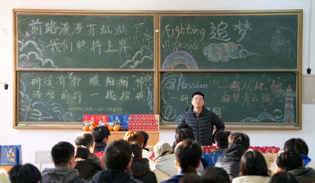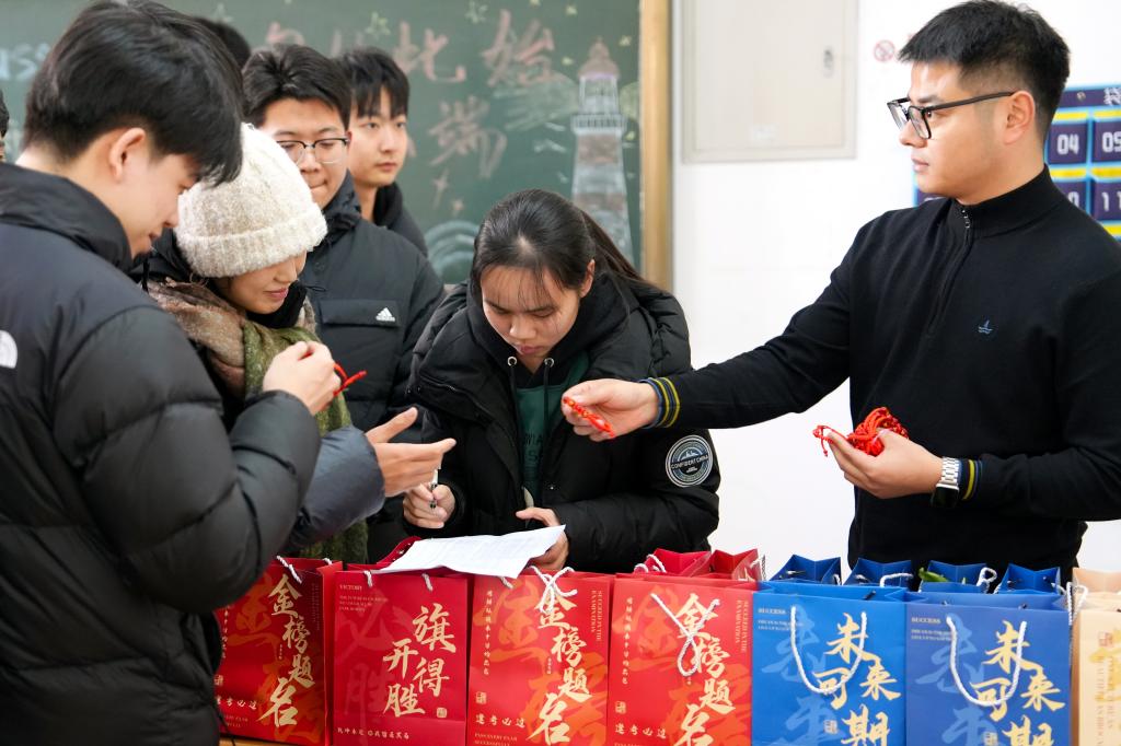 活动现场暖意融融,温情涌动。学院相关负责人与教师代表寄语考研学子,字字句句饱含期许:“冲刺阶段需张弛有度,既要保持高效复习的专注,亦要懂得劳逸结合、调适心态。你们长久以来的积累与沉淀,终将成为考场上的底气。”朴实真挚的话语如春风化雨,为学子注入奋进动能。“学院永远是你们的坚强后盾,愿你们带着初心与坚持,从容落笔、不负韶华!”这份承诺让在场学子倍感温暖。毕业班辅导员、专业教师与学弟学妹们手持“薪火相传 研途筑梦”定制卡片,一笔一画写下“笔锋所至皆坦途”“考研加油,未来可期”等暖心祝福,并为每位学子佩戴象征好运的祈福红绳。红绳轻绕手腕,传递着跨越年级的情谊与鼓励,成为这个冬日里最温暖的印记。
