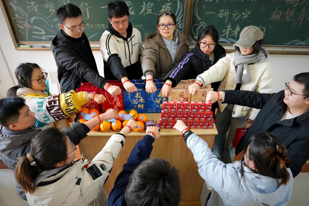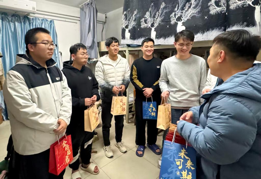 学院还贴心准备了寓意深远的慰问品:旺仔牛奶寄寓“旺运加持”,巧克力蕴含“巧破难关”之志,糖果甜润疲惫身心,橙子则谐音“一战‘橙’硕”,满载对学子金榜题名的美好祝愿。每一份礼物都承载着学院的细致关怀,将温暖融入点滴细节。