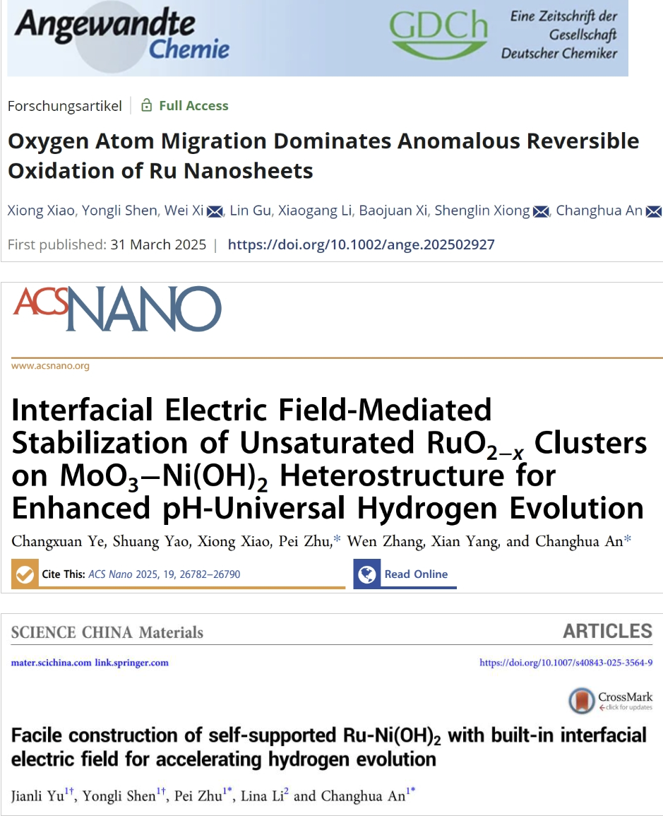 我院安长华教授团队在钌(Ru)基纳米催化剂的可控设计及其在大电流密度电解水制氢研究取得重要突破,其研究成果相继发表于《Angewandte Chemie International Edition》《ACS Nano》《Science China Materials》等国际高水平期刊。