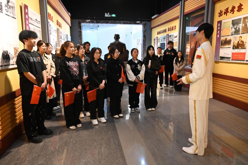 在陵园纪念馆内,马克思主义学院教师李飞以《就义诗》为切入点,讲述了抗日名将吉鸿昌“恨不抗日死,留作今日羞”的慷慨悲歌。他结合珍贵历史影像资料,还原了吉鸿昌将军在狱中写下绝笔信、英勇就义的壮烈场景。“吉鸿昌将军用生命诠释了‘国破尚如此,我何惜此头’的坚定抗日信念和民族气节,这种精神在今天依然闪耀着火热的光芒。”李飞老师勉励青年学生讲到,“我们要从英烈精神中汲取奋进力量,让青春在新征程上绽放光芒。”
