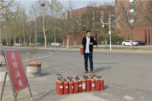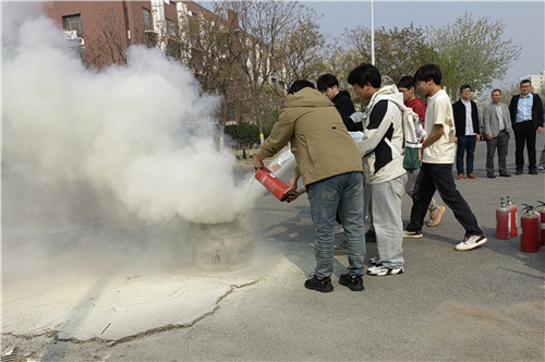 随后,在学校西南角空地,保卫处寇林峰老师详细讲解了灭火器的种类、灭火器的使用方法。在专业消防人员的协助下,在场师生亲自上手使用灭火器进行了现场灭火实训。