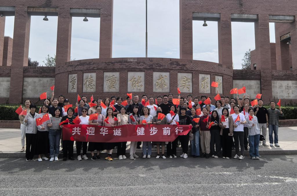 活动伊始,院长白国义发出“出发”指令,老师们集体从学校南门出发,一路沿知行道、思成路、健行道、大成路、日新道、明理湖健步走,最终到达新体育馆。在秋意渐浓的美丽校园,老师们用矫健轻快的步伐走出“7”和“5”的字样,向祖国献礼。