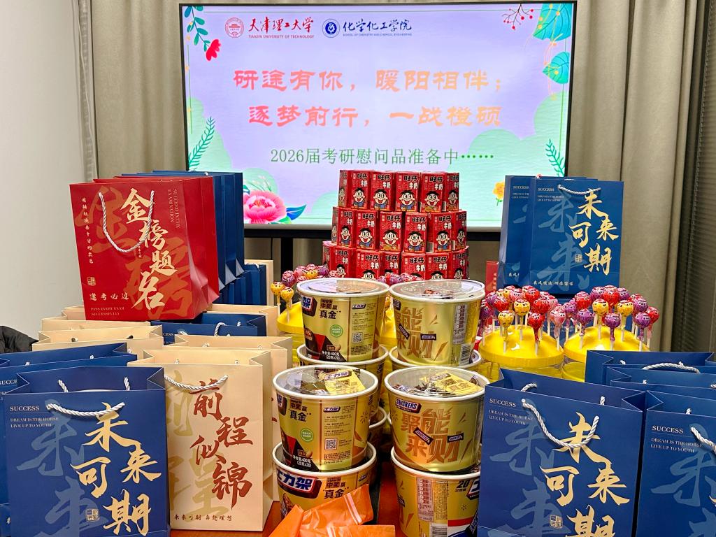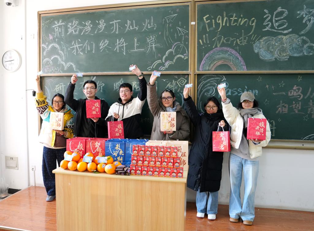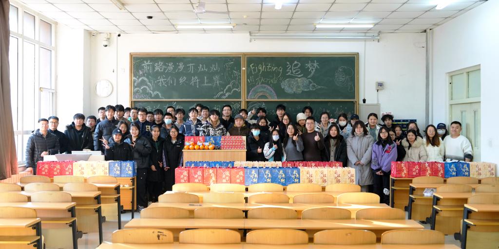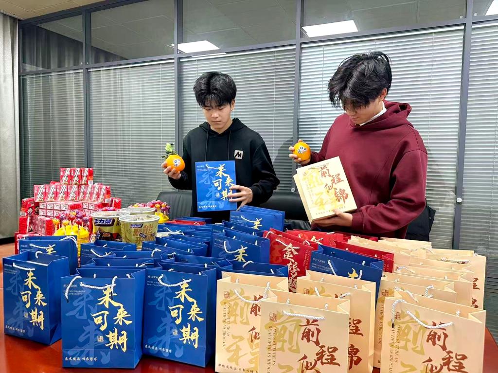 学院还贴心准备了寓意深远的慰问品:旺仔牛奶寄寓“旺运加持”,巧克力蕴含“巧破难关”之志,糖果甜润疲惫身心,橙子则谐音“一战‘橙’硕”,满载对学子金榜题名的美好祝愿。每一份礼物都承载着学院的细致关怀,将温暖融入点滴细节。
