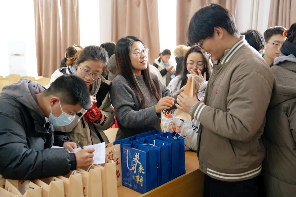 活动现场暖意融融,温情涌动。学院相关负责人与教师代表寄语考研学子,字字句句饱含期许:“冲刺阶段需张弛有度,既要保持高效复习的专注,亦要懂得劳逸结合、调适心态。你们长久以来的积累与沉淀,终将成为考场上的底气。”朴实真挚的话语如春风化雨,为学子注入奋进动能。“学院永远是你们的坚强后盾,愿你们带着初心与坚持,从容落笔、不负韶华!”这份承诺让在场学子倍感温暖。毕业班辅导员、专业教师与学弟学妹们手持“薪火相传 研途筑梦”定制卡片,一笔一画写下“笔锋所至皆坦途”“考研加油,未来可期”等暖心祝福,并为每位学子佩戴象征好运的祈福红绳。红绳轻绕手腕,传递着跨越年级的情谊与鼓励,成为这个冬日里最温暖的印记。