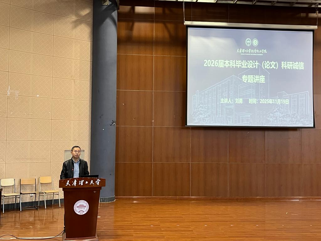 随后,学院教学副院长刘勇作毕业设计科研诚信专题培训。他着重强调科研诚信作为学术生命线的核心意义,结合典型学术不端案例开展警示教育,并针对毕业设计中实验数据采集、反应流程记录等关键环节可能存在的风险点进行深度剖析,引导毕业生严守学术规范。
