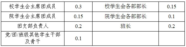 学生干部由院研究生秘书和辅导员认定,评分标准如下表所示。学生干部加分不累加,如在多处任职,只取加分最高的一项进行计算。
