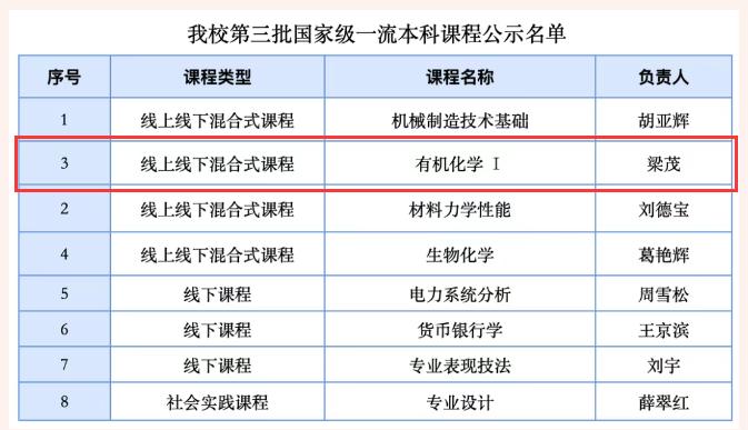 近日,教育部公示了第三批国家级一流本科课程认定结果,其中梁茂老师负责的线上线下混合式课程《有机化学I》成功入选,这是我院课程建设的重大突破,标志着我院本科教学水平和质量再上新台阶!